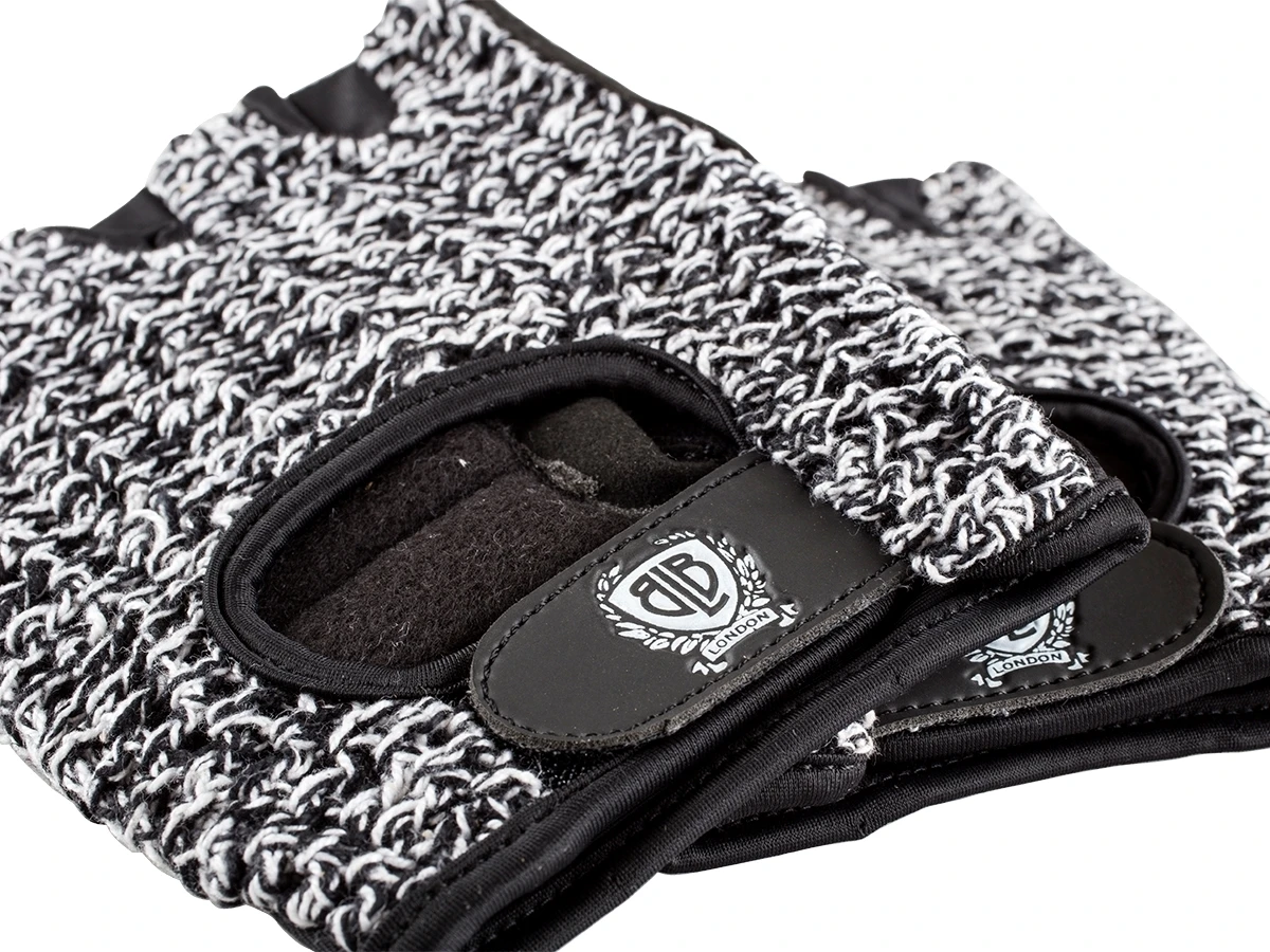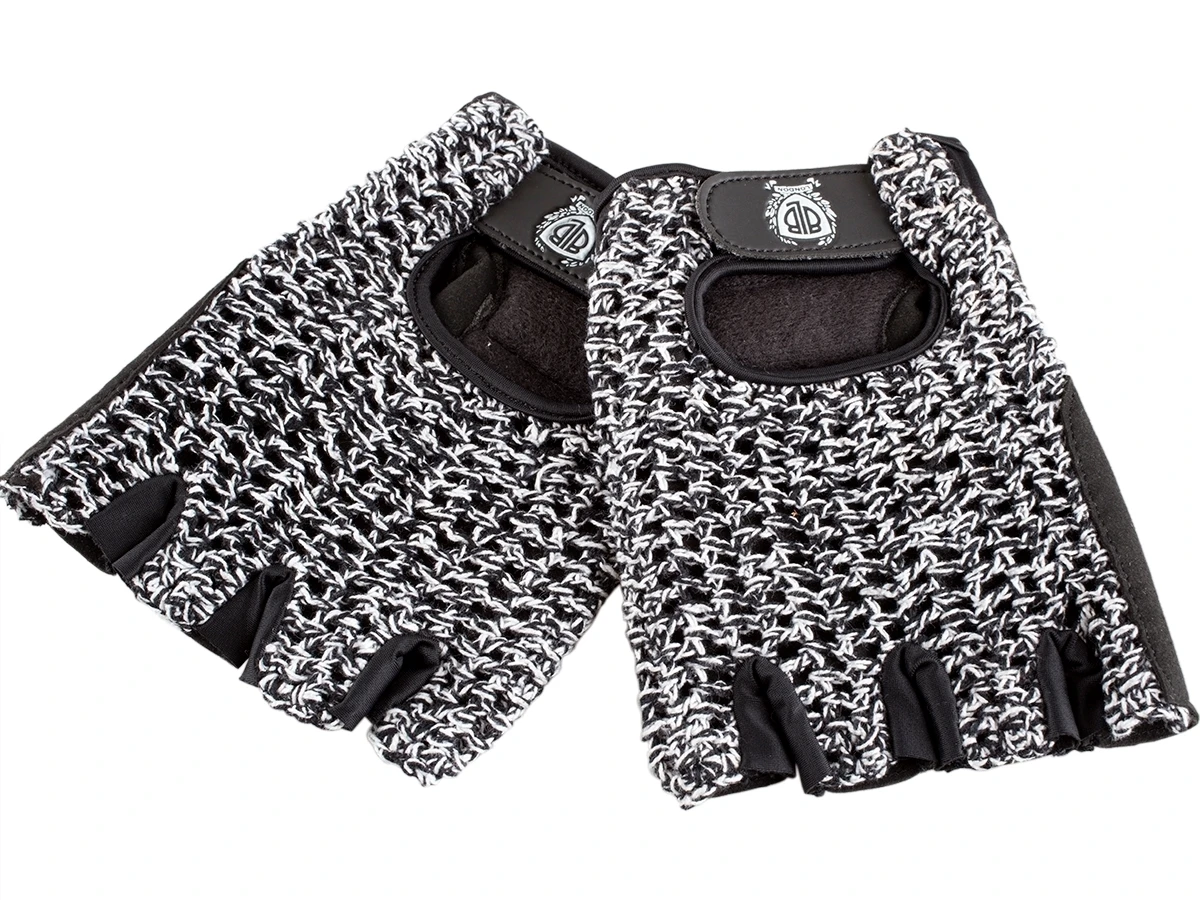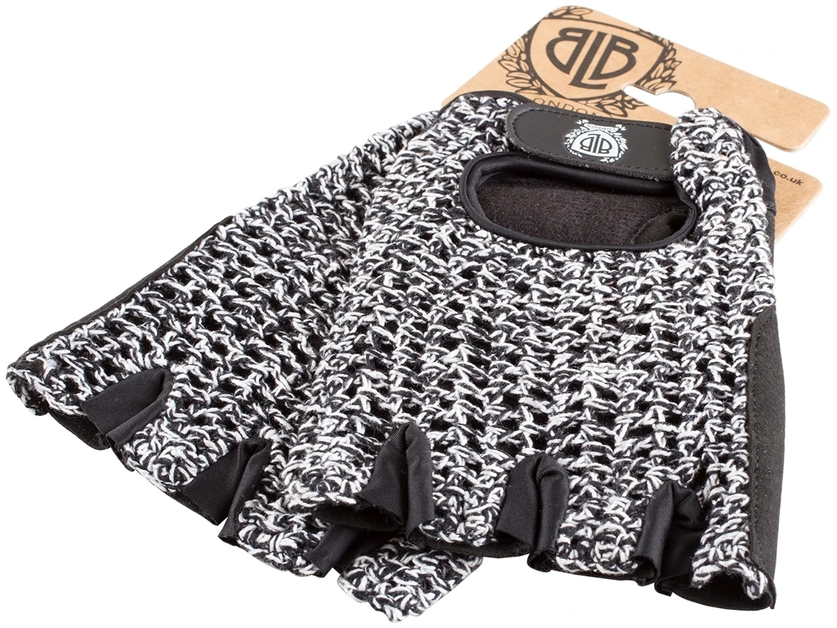 The BLB Cycling Gloves (white/black) have a crochet string back with cuff adjusters and a synthetic leather/suede palm with foam padding. Featuring our classic shield logo and lockring logo.