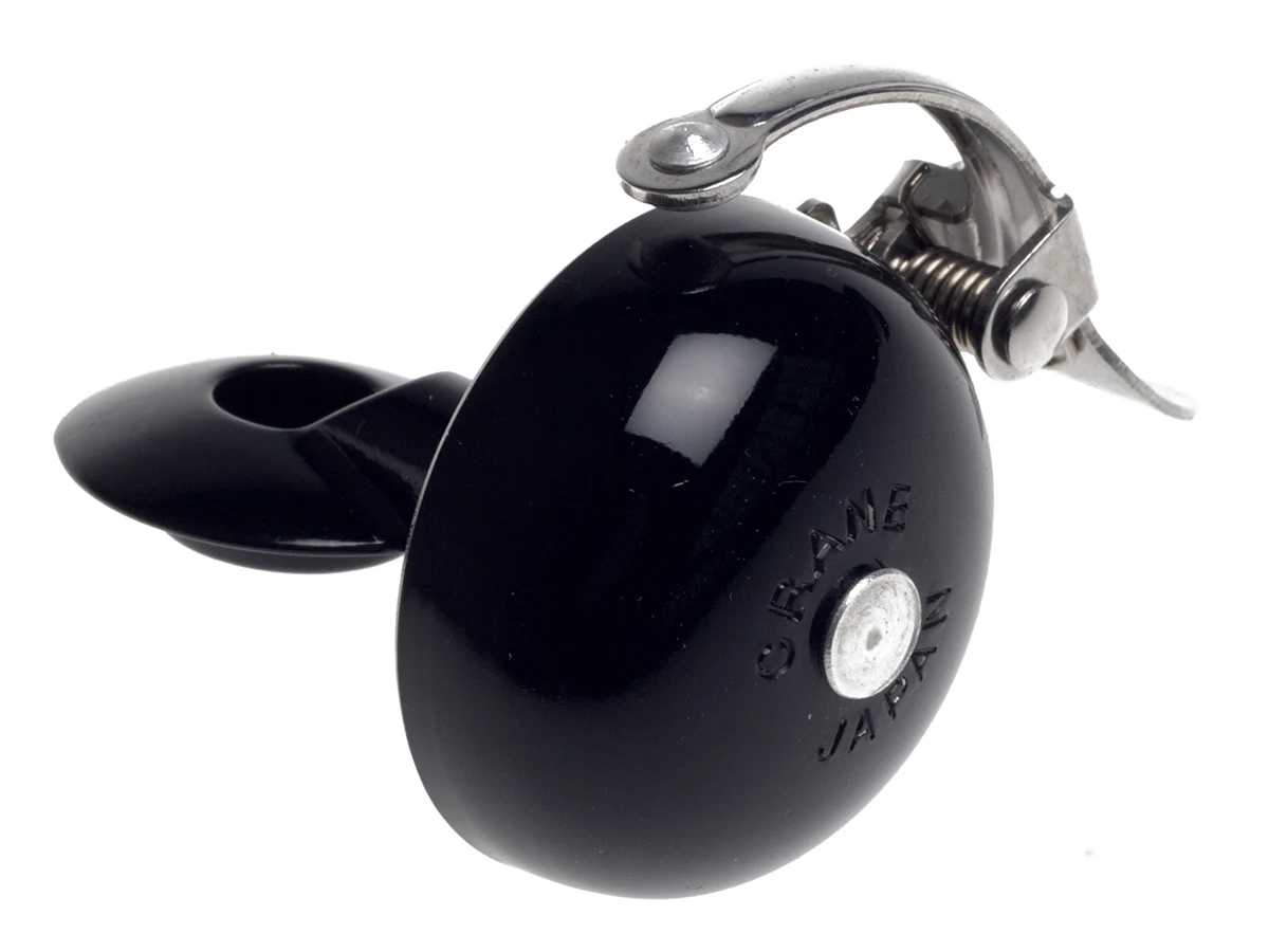 Crane bells are made in Osaka, Japan. These traditional designs are timeless and have beautiful clear ring tones. This is the small size bell from Crane, designed to replace a fork top cap, that is plenty loud – 50% louder than the little brass bells that aren’t quite loud enough, and louder even than your typical “ding-ding” bells. Every bike should have one.