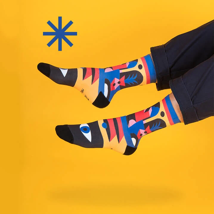 ‘The human being is imperfect by nature, and it is precisely this that makes us human. But we have the vision and the strength to correct mistakes and become a better person in the blink of an eye’ Marco Oggian For greater comfort and durability, our BE YOU socks in collaboration with the artist MARCO OGGIAN have reinforced toe and heel with anti-chafing seams. In addition, the cuff is elastic and has a support arch on the instep to fix the sock to the foot. The high-quality Coolmax fabric promotes moisture wicking, is soft and comfortable. Finally, we recommend machine washing at 30 °C / 86 °F. Avoid bleaching or ironing the socks. Socks will last longer if you avoid drying them in the dryer. Medium length unisex socks (Height: 16 cm) for all weather conditions.