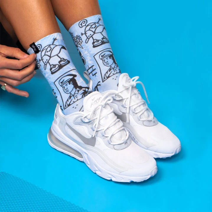 They say that the neighbourhood is the school of life. There you learn to earn respect, to identify bad cops and earn your first euros without a contract. And, yes, you also learn to dream about gangster stories! 😀 For greater comfort and durability, our BE YOU socks in collaboration with the artist MARCO OGGIAN have reinforced toe and heel with anti-chafing seams. In addition, the cuff is elastic and has a support arch on the instep to fix the sock to the foot. The high-quality Coolmax fabric promotes moisture wicking, is soft and comfortable. Finally, we recommend machine washing at 30 °C / 86 °F. Avoid bleaching or ironing the socks. Socks will last longer if you avoid drying them in the dryer. Medium length unisex socks (Height: 16 cm) for all weather conditions.