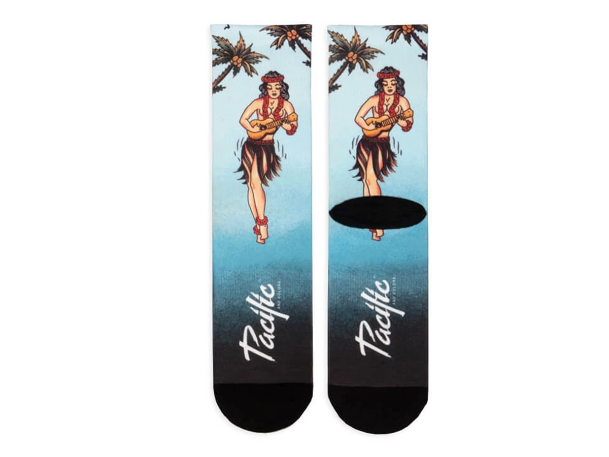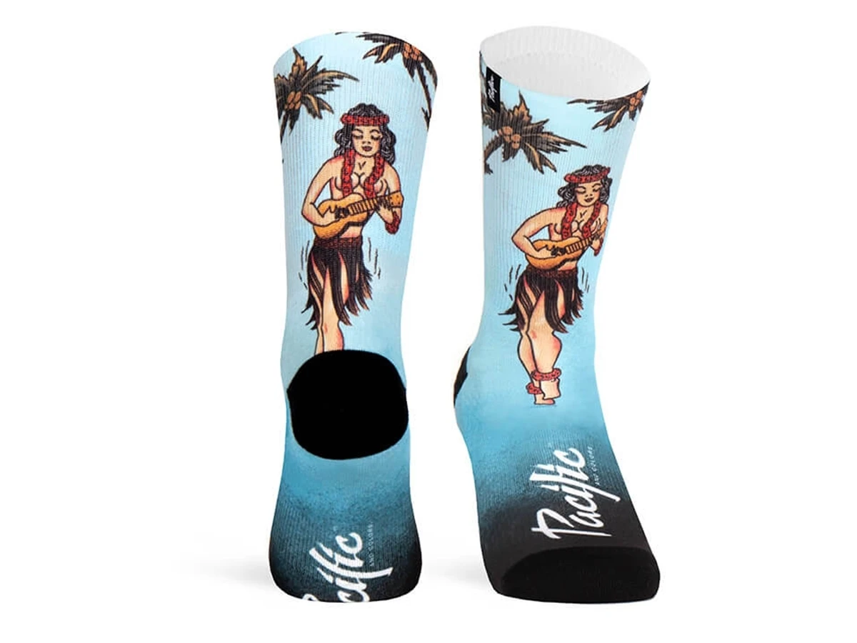 Imagining ourselves in Hawaii, playing the ukulele and dancing the Hula among palm trees. Yes, Hula Girls dance better, but you we wear these original socks, and feel the rhythm!
