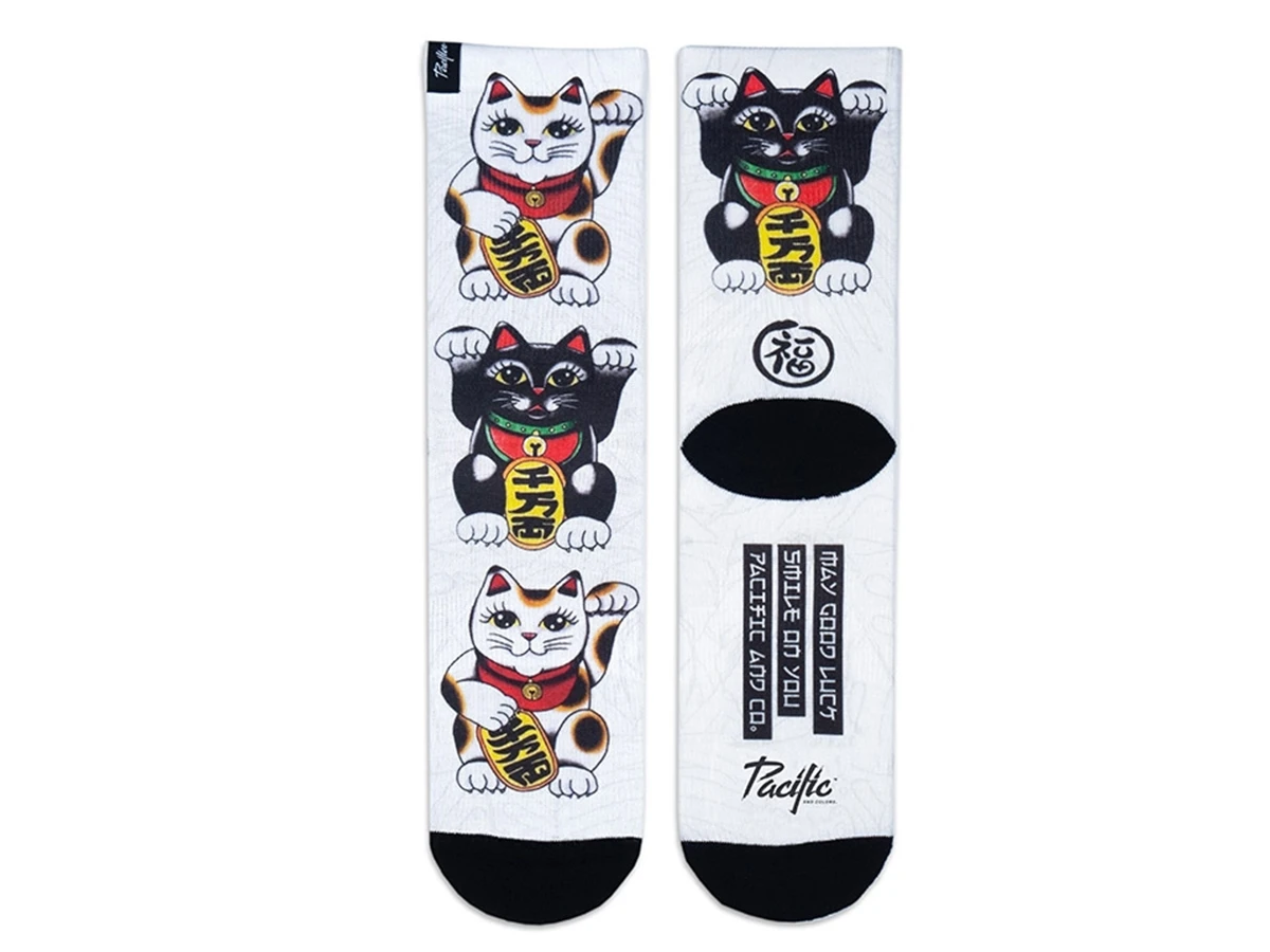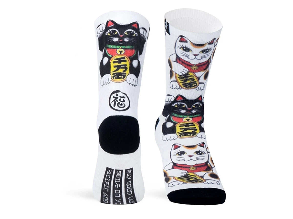 This Cat is famous all around the world. He is Maneki NEKO and is known for his infinite salutes, being a symbol of luck in the japanese culture. Luck bonus for the owner of these socks!