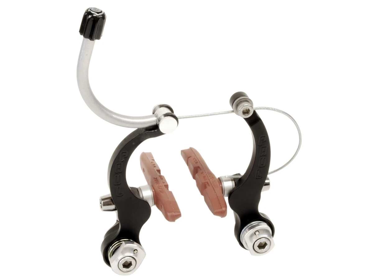 Arms of the MiniMoto have been shortened to match the leverage of standard road brake levers, making the MiniMoto compatible with drop bar brake levers with integrated shifters. The short curved arms give plenty of clearance for cyclocross tires or wide fenders. The spring tension is independently adjustable for each arm which means the brake can be precisely centered on the wheel and adjusted for return strength. Narrow Koolstop brake pads with threaded posts are included with the MiniMoto. These all-weather brake pads have spherical washers for pad angle adjustment, and mount to a slot for vertical alignment with the rim.