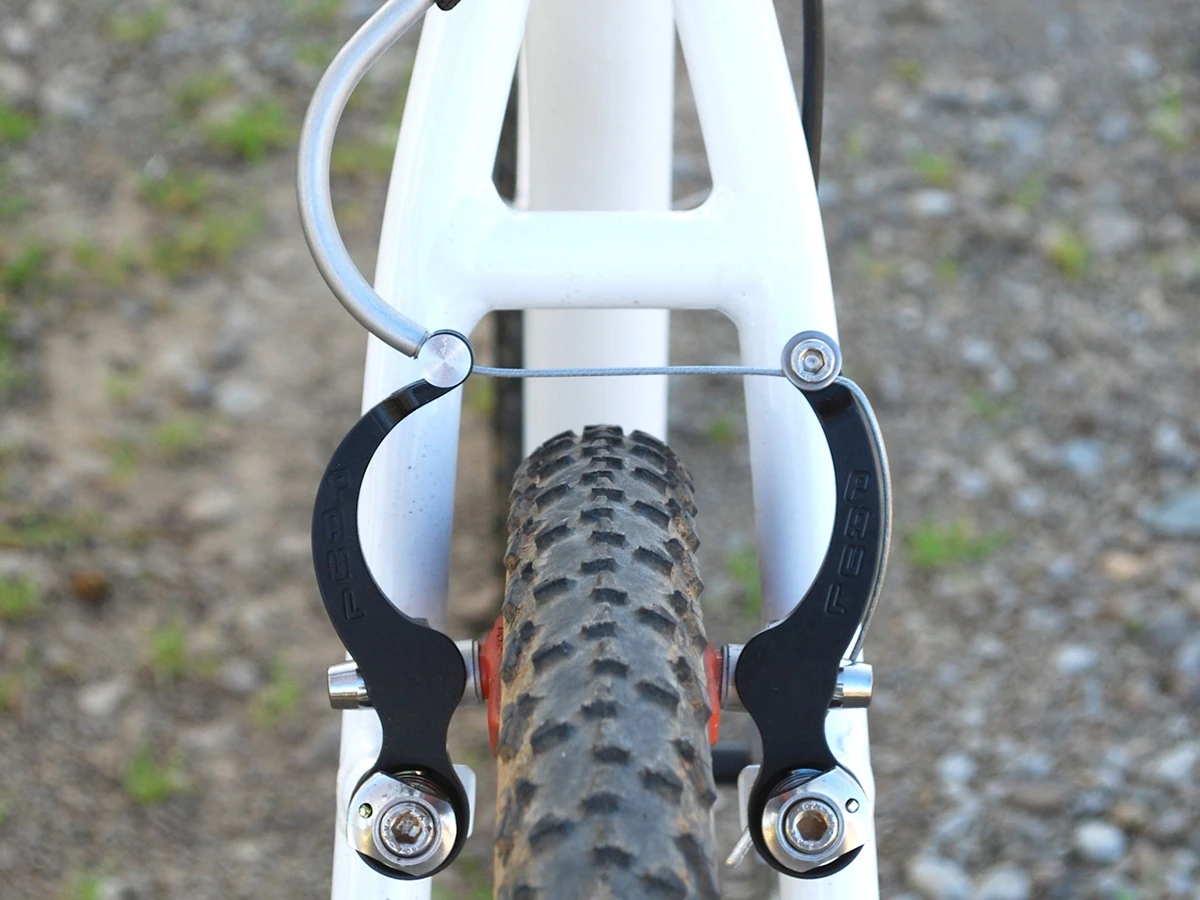 With a simple pivoting quick release on one arm, it’s easy to open the brake to remove a wheel. The cable enters the brake through a barrel adjuster at the top of the curved cable noodle. This adjuster makes it quick and painless to fine-tune the cable tension of the brake without tools.