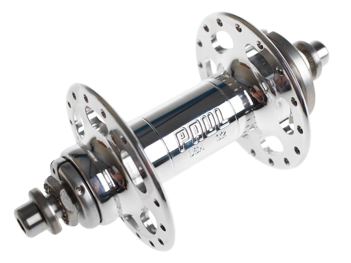 Paul Components High Flange hubs use high-fill sealed bearings. Spoke holes are chamfered to reduce stress on the head and elbow of the spoke.
