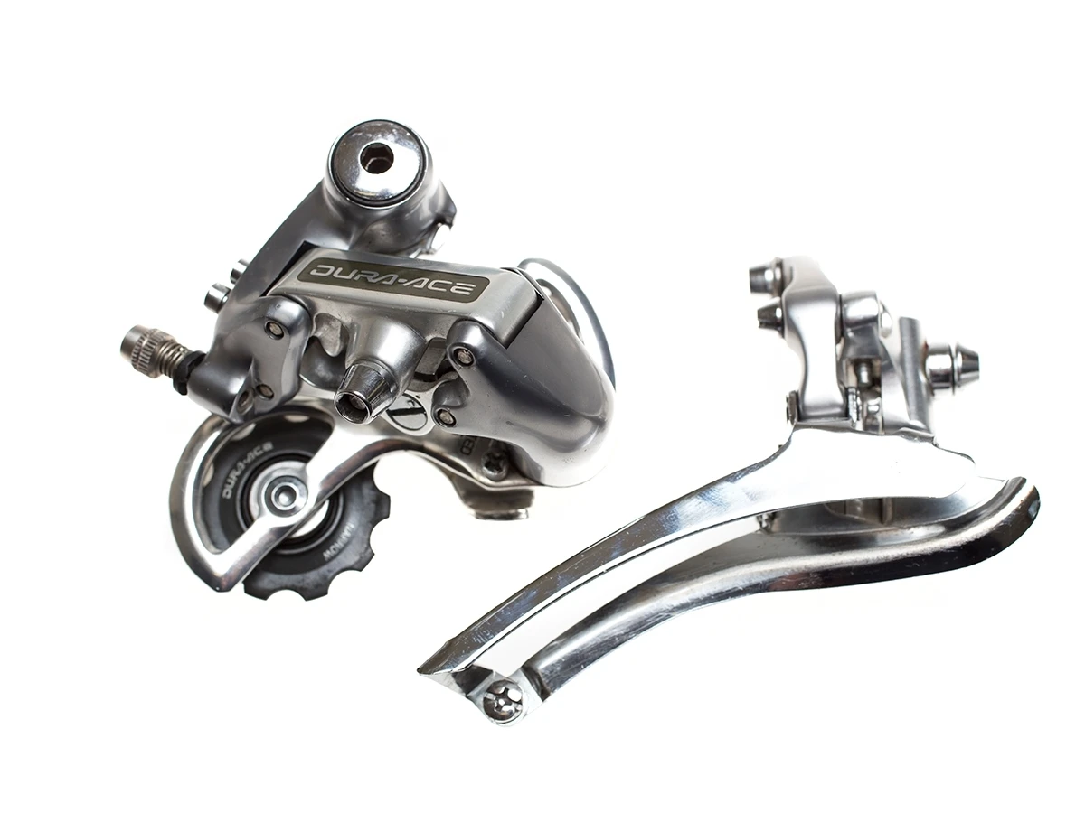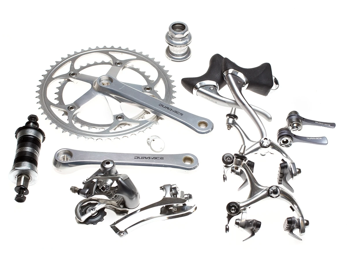 Groupset includes: cranks with caps, brake calipers, brake levers, downtube shifters, front & rear derailleur, headset and bottom bracket.Â