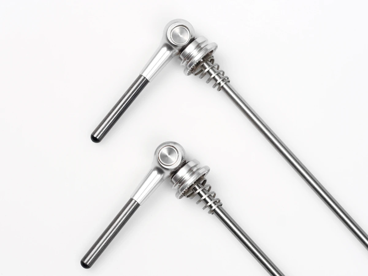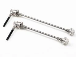 VIA Titanium quick release axle (silver) for road hubs. These elegant additions are strong and light due to the titanium axles and carbon levers – perfect bling for road bikes! Sold in pairs.